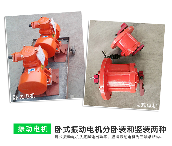 臥式振動電機分臥裝和豎裝兩種。 臥式振動電機從底腳輸出功率。振動電機的底腳安裝在振初機恥,產生圍繞電機轉軸的旋轉離心激振力。臥式振動電機的底腳有兩種結構:一種是與端蓋連在一起的,另一種是與機殼連在一起的,前者結構受力較好,可節約材料,降低造價。臥式臥裝振動電機通常為雙軸承結構,豎裝振動電機為三軸承結構。大噸位的臥式振動電機仍柒用與軌殼連在一起的結構型式。