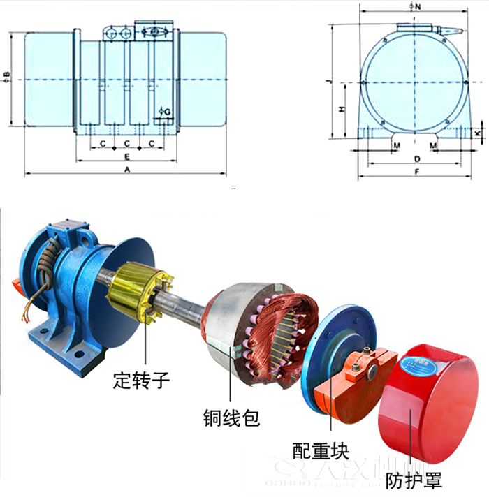 YZUL型立式振動(dòng)電機(jī)是動(dòng)力源與振動(dòng)源結(jié)合為一體的激振源,振動(dòng)電機(jī)是在轉(zhuǎn)子軸兩端各安裝一組可調(diào)偏心塊,利用軸及偏心塊高速旋轉(zhuǎn)產(chǎn)生的離心力得到激振力。由電機(jī)本身運(yùn)行產(chǎn)生易于調(diào)整的水平、垂直、傾斜等方向多元激振力,形成物料的快速平面分散、中心聚集、平面旋轉(zhuǎn)、三維旋轉(zhuǎn)等多種運(yùn)動(dòng)方式,用于控制排料速度、處理精度等機(jī)械性能指標(biāo),以其獨(dú)特的結(jié)構(gòu)特點(diǎn)適應(yīng)于不同的機(jī)械對(duì)振動(dòng)源的要求。